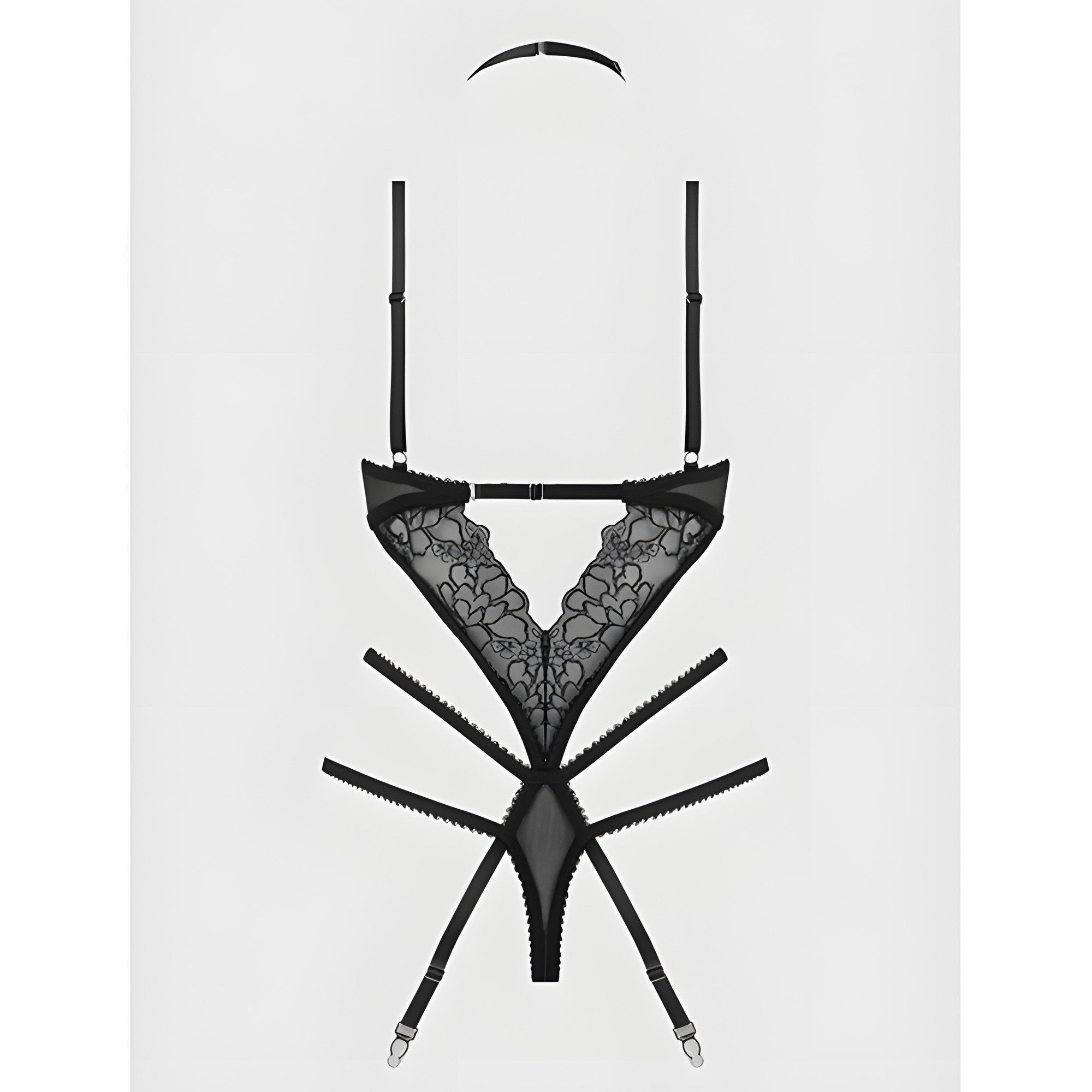 This seductive teddy accentuates with a deep overlapping V-neckline and captivating keyholes.