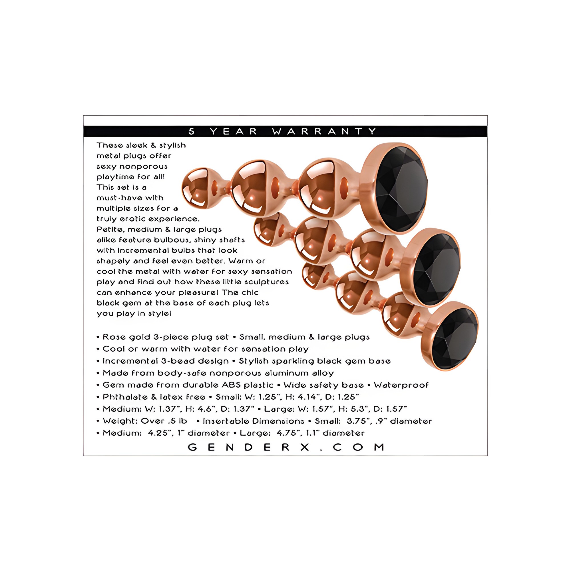The Gold Digger Plug Set is stunning! The rose gold and black combination is classy. The different sizes provide a variety of sensations, and they're fun to use in various ways. Highly recommended!
