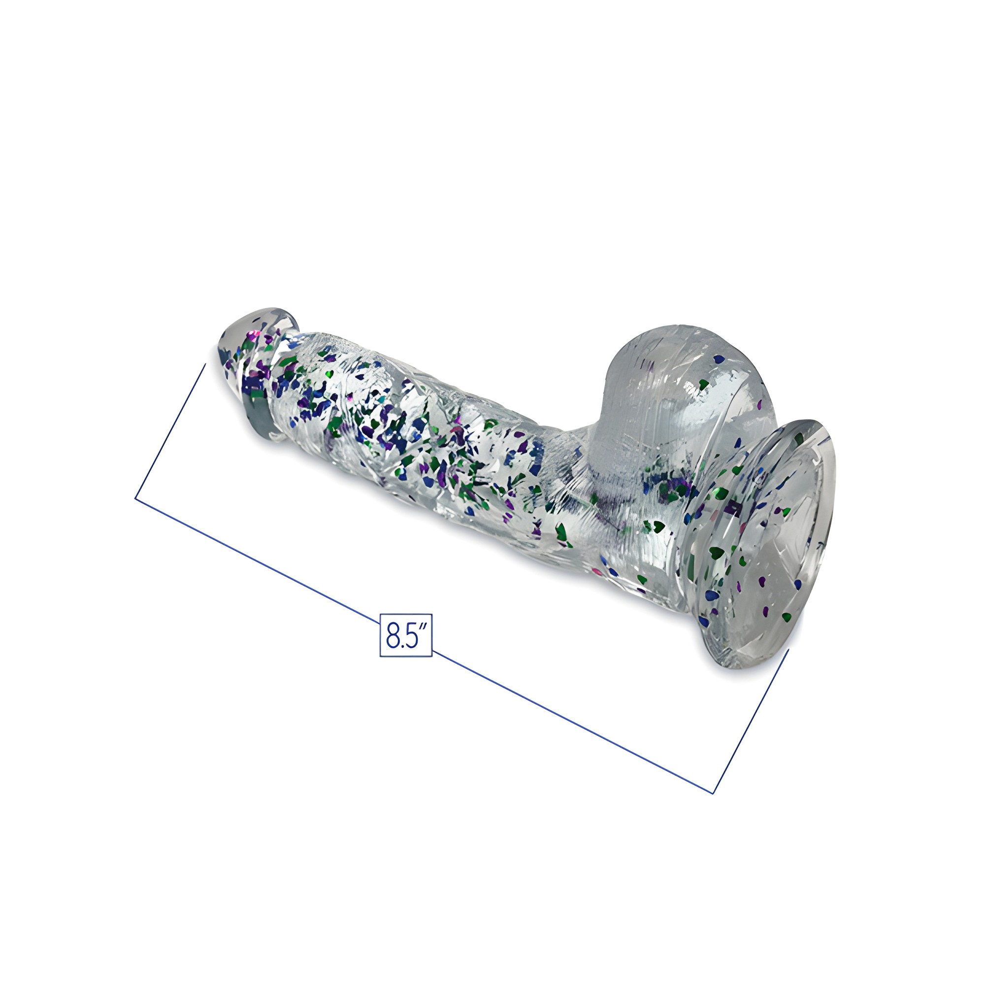 Fabricado en TPR transparente, este dildo presenta un brillante glitter en tonos metálicos de azul, púrpura y violeta para un aspecto impactante.