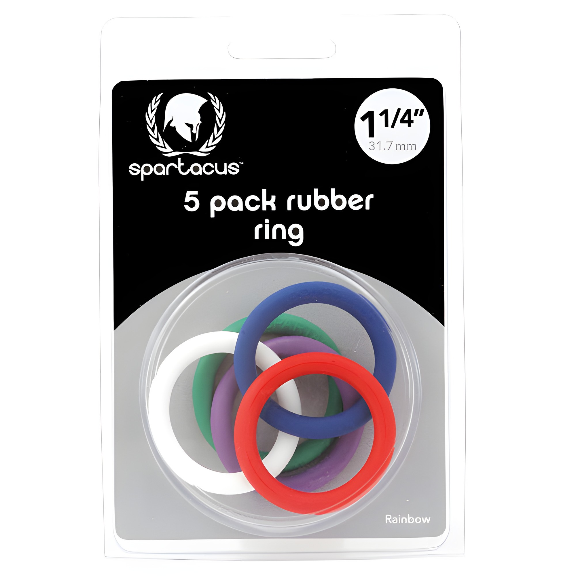 Desbloquea nuevos niveles de placer con el Spartacus Set de 5 Anillos de Pene de Goma de 1.25", que presenta un vibrante diseño de arcoíris.