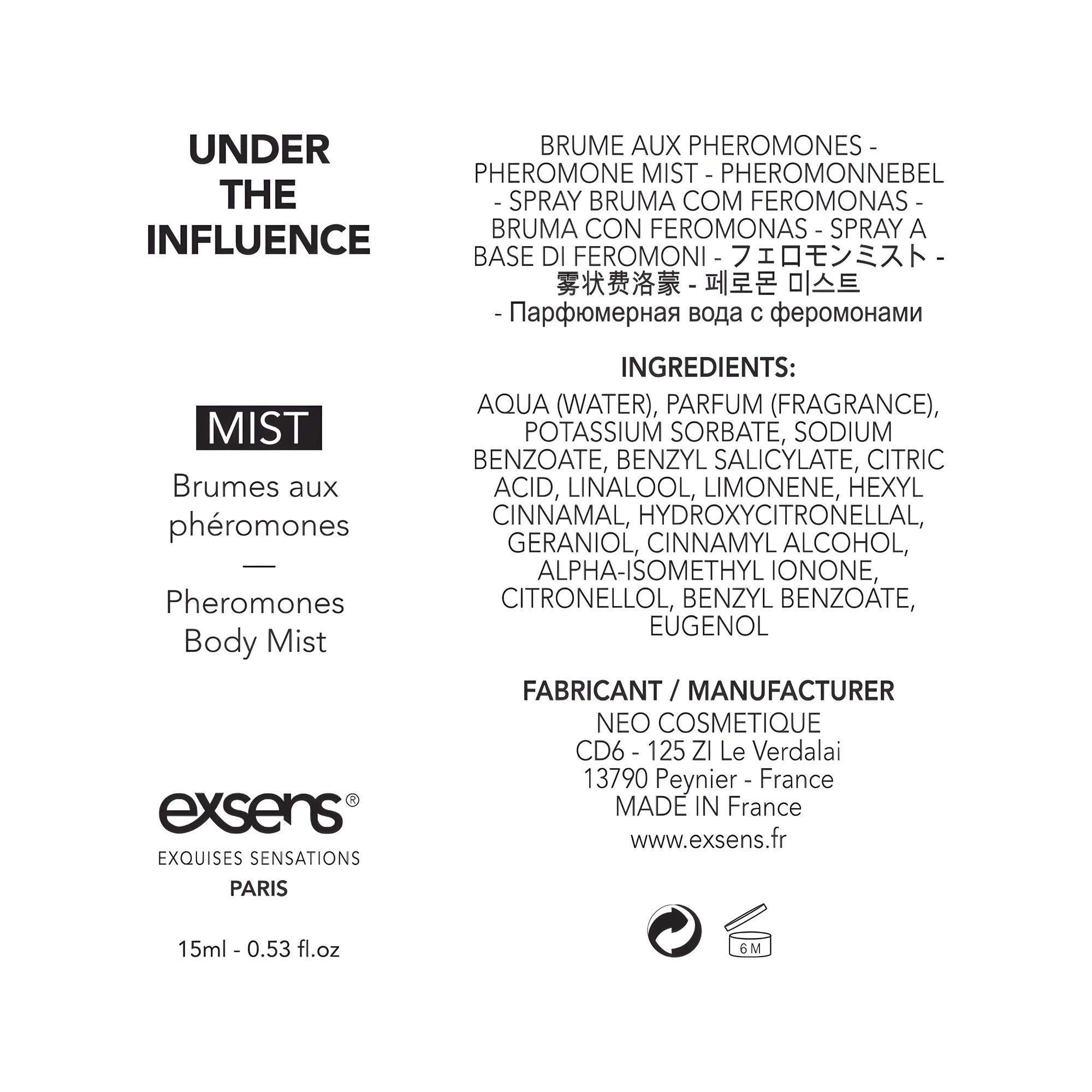 Aumenta tu atractivo con la Bruma Corporal EXSENS de París infundida con feromonas.